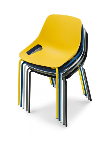 Cadira d'ús polivalent per a oficina per a sales de reunions, confidents, etc amb estructura de 4 peus de color blanc i cara¡cassa de plàstic en diferents colors. El disseny és molt divertit i actual que es pot combinar amb la col·lecció de cadies giratòries amb estructura blanca.