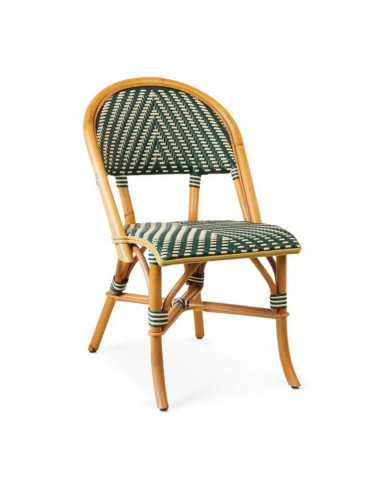 Bonica cadira clàssica amb estructura de canya natural. Teixit trenat sintètic disponible en diversos colors. Ideal per decorar la terrassa del teu local.