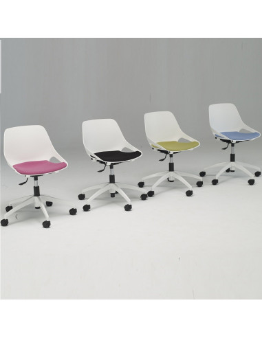 Cadira d'estudi giratòria juvenil de colors, de disseny molt divertit i actual. Gran combinació de colors. Tapisseria del seient en diferents colors. Sistema de gas per regular l'alçada. Base de color blanca fabricada en poliamida. Carcassa de seient - respatller fabricat en blanc (altres colors sota comanda).