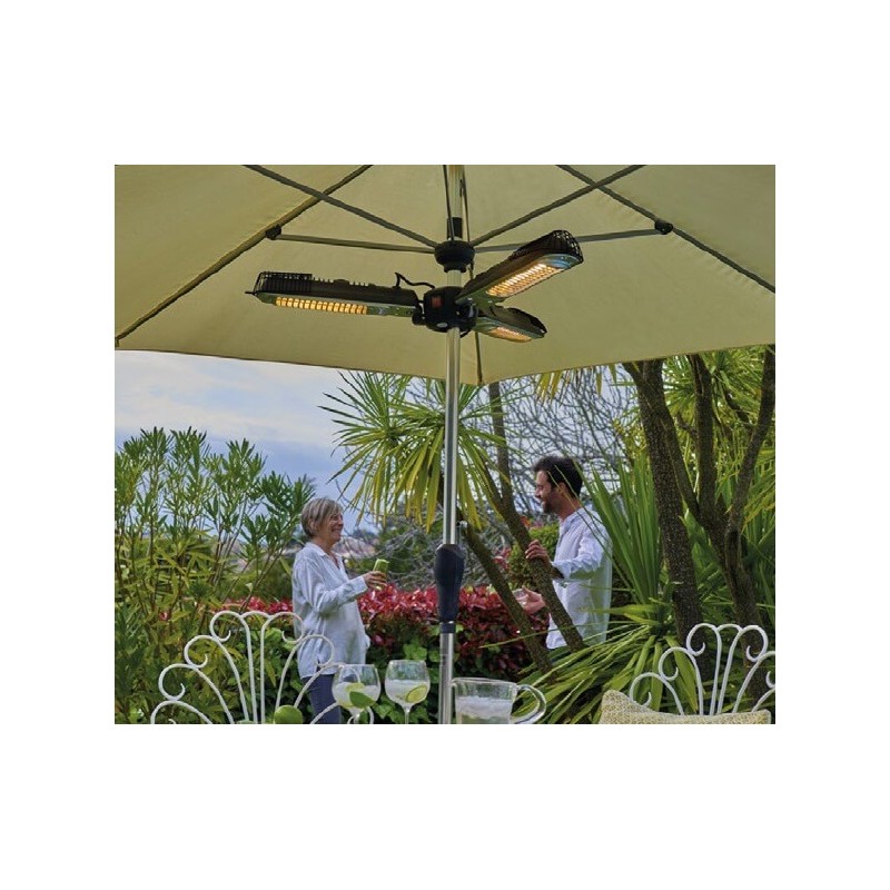 Calefactor elèctric per a posar al pal dels parasols amb màstils de 25 a 60 mm de diàmetre. També es pot col·locar sobre un trípode. Es pot plegar. Format per 3 làmpades de 650 w. Potència Total de 2000 watts. Les làmpades poden ser activades de manera independent.