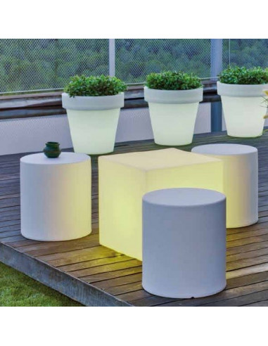 Tauleta Cubo disponible en 2 mides: 32x32cm y 43x43cm. Regalat aquest PUF que a les fosques pots il·luminar. Serà la sensació del local i de totes les festes. Disponible en dues opcions: llum amb cable i bombeta LED o llum amb càrrega solar i USB amb bombeta LED RGB.