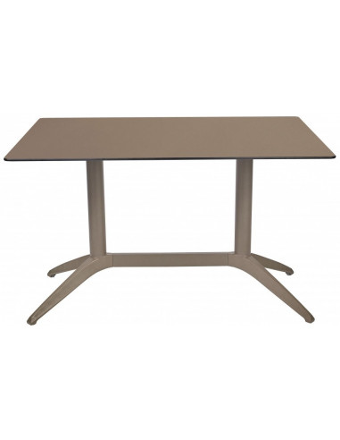 Taula rectangular per a terrassa d'hostaleria ade disseny molt moderna i actual. Fabricada amb base de polipropilè reforçat amb fibra de vidre amb tub d'alumini a joc. Disponible en diversos formats i colors. Tauler en compacte fenòlic. veure a joc la taula de la mateixa col·lecció amb taulell compacte fenólic.