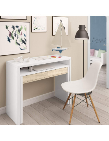 To use commo desktop, it moves the bottom, which offers a wide surface of work to be able to work with computers, books, etc. once closed, the desktop acts as a shelf to place the books and the material larger. 2 drawers lower to always keep the surface tidy.