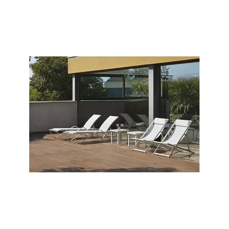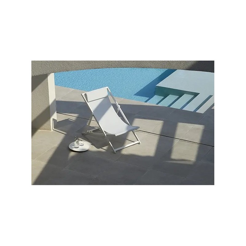 The SAND folding sun lounger by GARBAR is the perfect choice for beaches, pools and hotels looking for comfort, durability and a lightweight design. Made of aluminium painted in white RAL 9016 with textilene fabric available in white or taupe, it is stackable, reclinable in 4 positions and designed for intensive outdoor use.