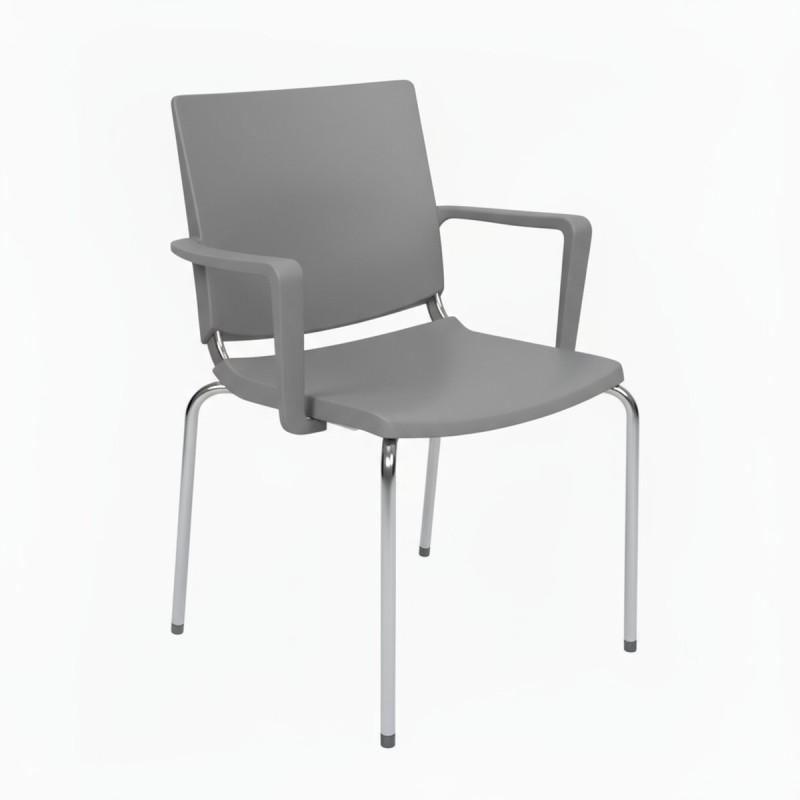 Stackable chair with a 4-foot polyvalent design with armrests, black or chrome finished metal structure. Back and seat in polypropylene, available in various colors. As an option, the seat can be upholstered. Its design with refined lines allows it to be accommodated in spaces as diverse as meeting rooms, offices or restaurant dining rooms. Easy maintenance.