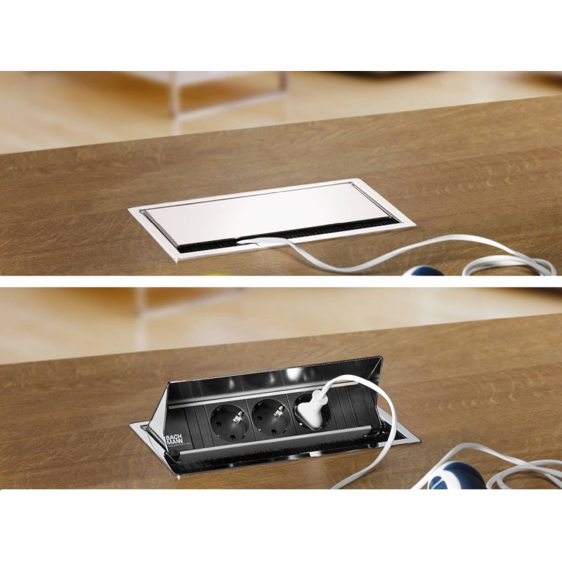 La caja de conexiones CONI de BACHMANN ofrece una solución integrada para espacios de trabajo, permitiendo una flexibilidad completa al proporcionar acceso a corriente, medios y datos. Su diseño se adapta a la superficie del mueble y garantiza la funcionalidad sin comprometer el espacio para las piernas, incluso cuando se instala en el borde de la mesa.