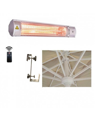 Calefactor eléctrico que puede ir anclado a pared, a sombrilla o con pie autoportante. Pueden instalarse a alturas entre 2 y 6 metros y proporciona calor instantáneo de gran potencia. Potencia 2 kw. Color: plateado. Anclaje trasero que permite colocarlo en pared, techo o barras de toldo /pérgolas. Calefactor radiante con luz halógena. Accesorios disponibles: Soporte para sombrilla y pie.