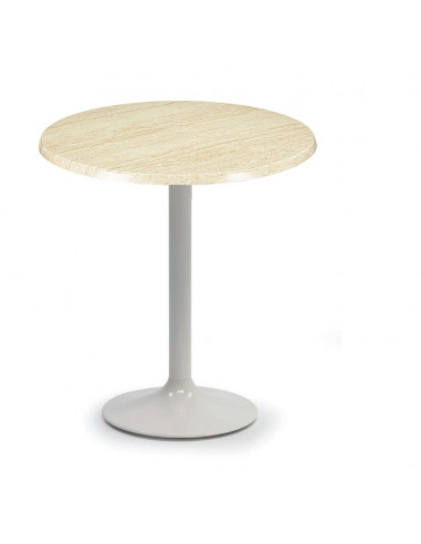 Mesa para restaurante, bar y cafetería prime de uso interior y uso exterior bajo cubierto, formada por un pie columna blanco y un tablero en material werzalit de diámetro 60cm de distintos colores. La mesa tiene una estética moderna que encaja en muchos ambientes y a la vez es muy económica.