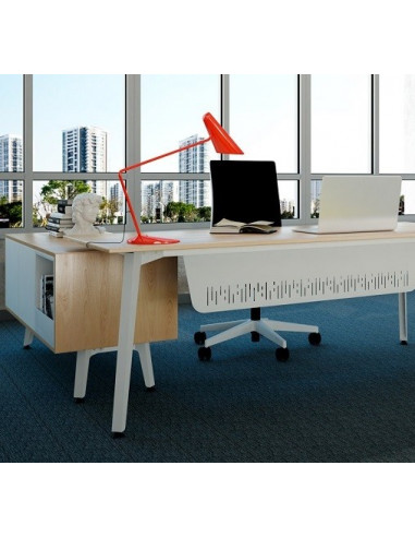 Conjunto de mesa de dirección con mueble soporte ORIGEN de diseño. Esta serie de muebles de oficina para despachos de dirección, está inspirada en el origami japonés para dar una imagen actual y moderna a su oficina. La mesa se ofrece en 2 acabados: en tablero de melamina y tablero en chapa de madera barnizada. La mesa está disponible en tamaño de 200cm.