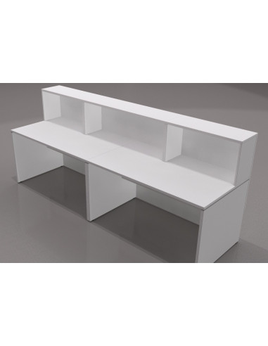 Gran mostrador de oficina recto de 280cm de largo. Para 2 puestos de trabajo en la parte interior. Disponible en varios colores. Medida total 2.8m. Se puede modular a otras medidas bajo pedido. El mostrador está formado por 2 mesas de trabajo de 140x80cm. La altura total del mostrador es de 117.5cm.
