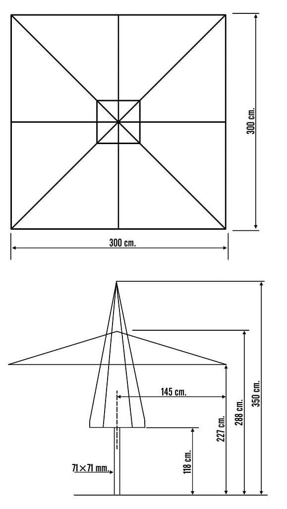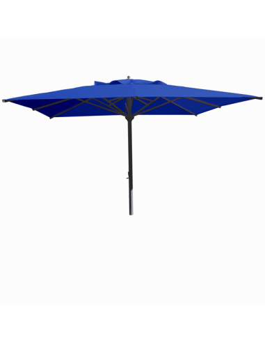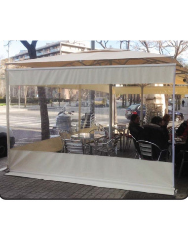 Parasol telescópico cuadrado de 3x3m profesional con los accesorios para adecuar la terraza de su local, bar o restaurante: parasol en tejido de poliéster crudo o en tejido acrílico (colores a elejir), que pueden montar como opción faldón decorativo, cortinas laterales paraviento y el canal verteaguas para colocar entre parasoles. Apertura con manivela.