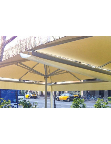 Serie HD formado por parasol cuadrado de 2x3m con todos los accesorios para adecuar la terraza de su local: parasol en tejido de poliester color crudo o en tejido acrílico (colores a elegir), que pueden montar como opción el canal verteaguas para colocar entre parasoles.