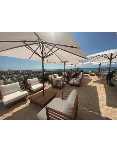 Parasol de madera para hostelería cuadrado de 3x3m para adecuar la terraza de su local, bar o restaurante: parasol en tejido de poliéster color crudo. Ver base opcional a juego.