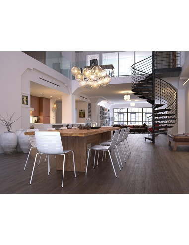 Silla de cuatro pies apilable para instalaciones y contract de uso interior. Carcasa inyectada en fibra de vidrio y Polipropileno. La estructura de la silla está formada por 4 varillas de acero pintado en color blanco o negro. Carcasa de la silla en varios colores.