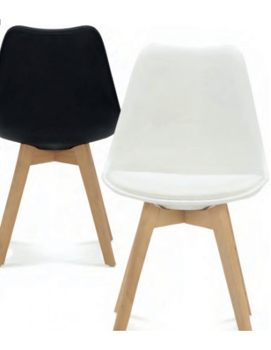 Silla de diseño con asiento monocarcasa de polipropileno en color blanco o negro con pies en forma de trípode en madera de haya natural barnizada. Asiento con cojín en ecopiel del mismo color que la carcasa.