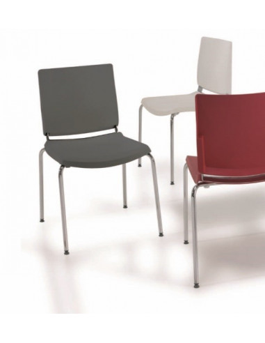 Silla de oficina apilable polivalente, de 4 patas. Diseño perfecto para cualquier espacio en una oficina y despacho. Estructura metálica, acabado cromado o negro. Respaldo y asiento en polipropileno, disponibles en varios colores. Como opción, el asiento se puede tapizar. Su diseño de líneas depuradas, permiten ubicarse en espacios de la oficina tan diversos como una sala de reuniones, salas de visita, un office. Perfecta también en hostelería, cómoda para restaurantes y bares. Ver a juego silla de despacho con brazos y giratoria.