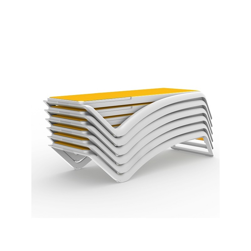 Tumbona apilable para uso interior y exterior. Estructura de polipropileno reforzado con fibra de vidrio. Textilene 500 gr/m2, termosoldado para mayor resistencia. Reclinable en 5 posiciones, incluyendo posición extraplana ideal para estar tumbado boca abajo. Respaldo con tope de seguridad. Ruedas en patas traseras y tacos antideslizantes en las delanteras y traseras.