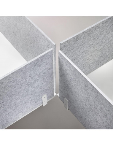 Panneau acoustique phono-absorbant pour séparer les tables. Composé d'un profil en aluminium anodisé argent mat et d'un panneau avec un pourcentage élevé de PET recyclé: 60% de fibres de polyester recyclées à partir de bouteilles en plastique et 40% de nouvelles fibres de polyester. Propriétés acoustiques: alpha m: 0,25. NRC: 0,30. Epaisseur du PET de 0,9 mm. Disponible en 7 couleurs.