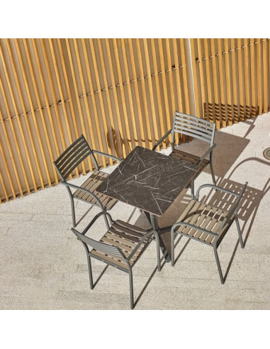 Table de terrasse CHR avec un tableau de pliage (empiler horizontalement) conçu avec une base en aluminium. Avec panneau compact à grande densité, disponible dans différentes couleurs.