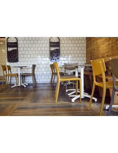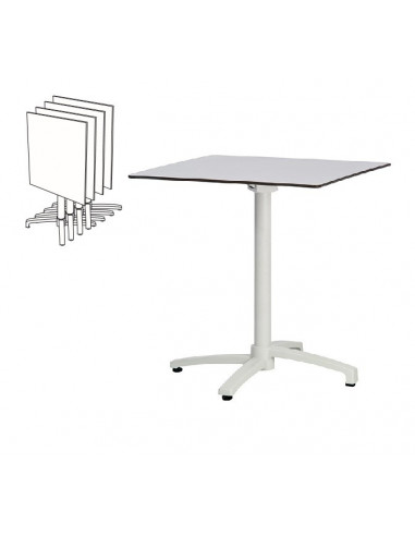 Table de terrasse CHR avec un tableau de pliage (empiler horizontalement) conçu avec une base en aluminium. Avec panneau compact à grande densité, disponible dans différentes couleurs. Panneau rabattable qui permet de regrouper des tables à la ligne