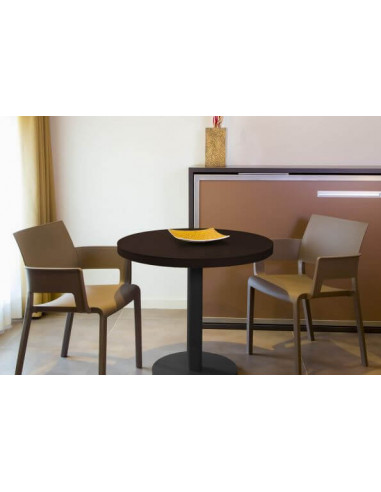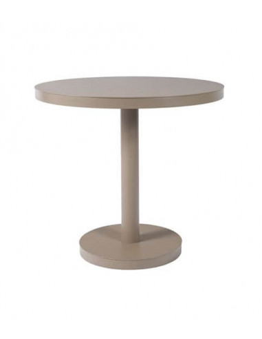 Table ronde avec pied central pour une utilisation intérieure et extérieure. Diamètre: 60 cm ou 80cm. Cadre en aluminium anodisé de 40x40 mm et 1,5 mm d'épaisseur, avec environ 3 mm d'épaisseur. Base ronde diamètre 35 cm et tube diamètre 6 cm. En noir ou sable.