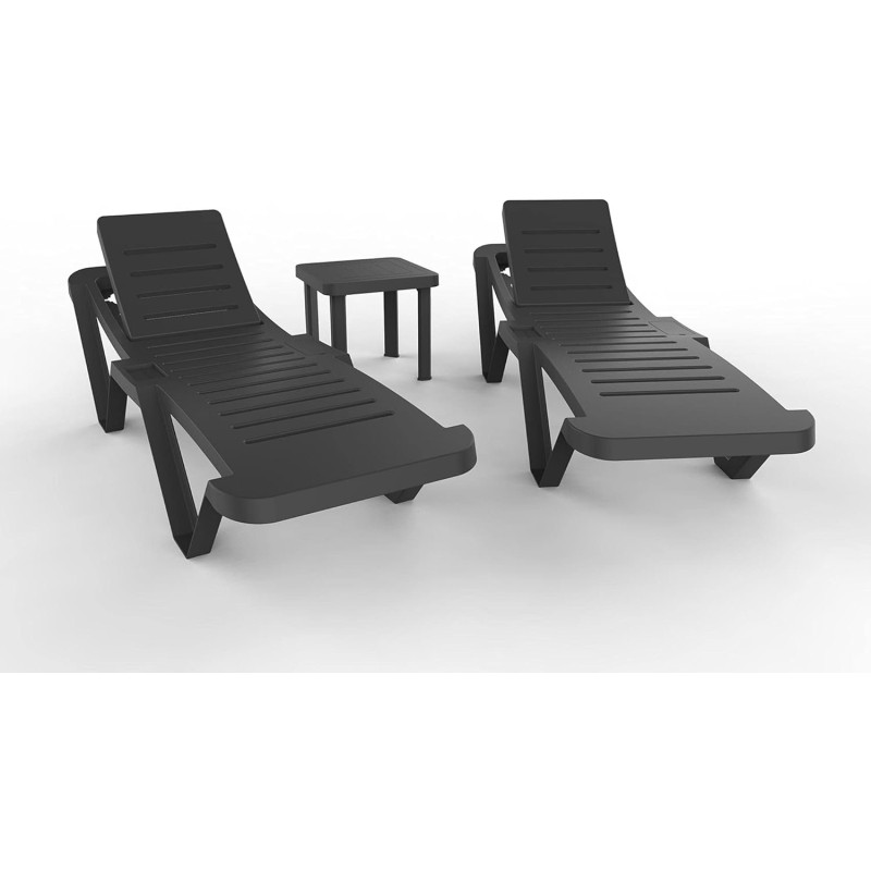 Goditi il massimo comfort all'aperto con questo set di mobili da esterno composto da 2 lettini prendisole MASTER reclinabili e impilabili e un tavolino ANDORRA. Ideale per giardini, terrazze e piscine, questo set unisce funzionalità, design e resistenza.