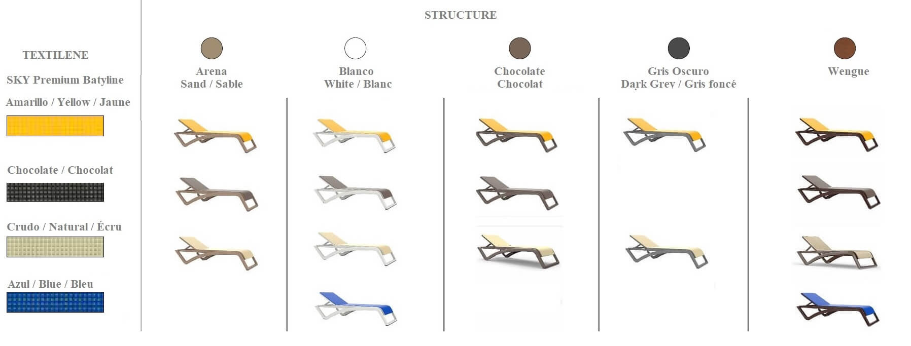 Nota: La differenza tra il lettino SKY CLUB e SKY PREMIUM è il tipo di tessuto. La struttura e le caratteristiche sono le stesse.