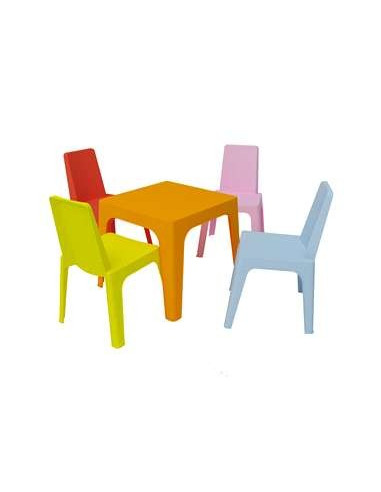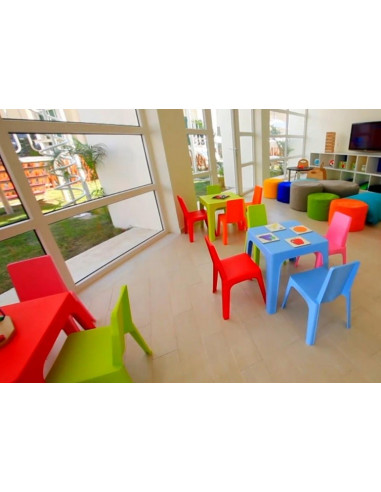 Tavolo per bambini in vari colori. La tabella è impilabile e può essere utilizzato all'interno: camera per bambini, scuole, centri di cura di giorno, ecc come in esterno: giardino, terrazza, ecc Disponibile in vari colori: rosa, arancio, rosso, verde e blu . Per impostare con sedia Julieta.