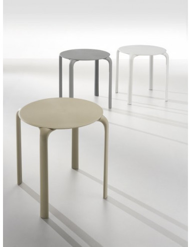 Tavolo fisso modello a GOCCIA con un diametro di 70 cm e 71,8 cm di altezza, realizzato in polipropilene caricato con fibra di vetro, con l'iniezione di un secondo materiale interno. Base a 4 gambe con tappi di gomma. Impilabile fino a 6 unità in verticale, nei colori bianco, grigio o sabbia. Uso interno ed esterno. Vedere la sedia DROP per giocare.