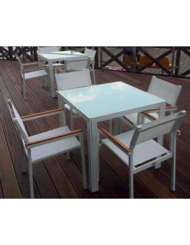 Il tavolo da terrazza per esterni appartiene alla collezione SHIO di GARBAR. La collezione ha tavoli di diverse dimensioni, sedie e sedie a sdraio, lettini e tavolini per attrezzare terrazze di ristoranti e piscine di hotel.