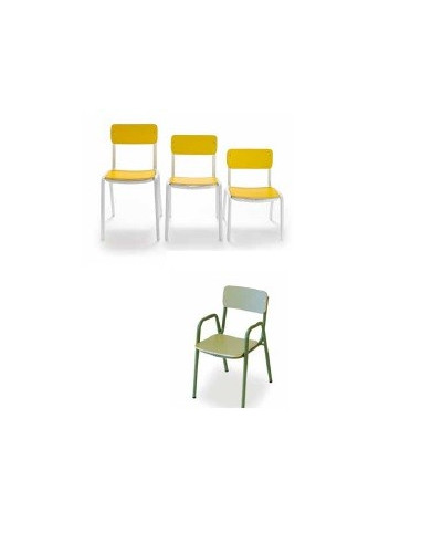 Tabella di scuola materna è di forma rettangolare. Struttura in tubo di acciaio di diametro 30 mm e spessore 1,2 mm verde. Su DM di 18 mm, laminato in vari colori, con spigoli arrotondati verniciati con poliuretano.