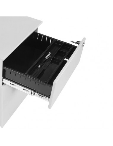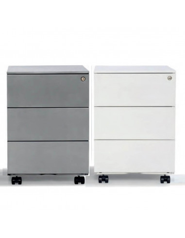 Cômoda de escritório de metal para colocar debaixo da mesa e poder ter uma mesa arrumada. As gavetas abrem 100% (totalmente abertas) para facilitar o acesso ao seu conteúdo. Cômoda de metal com rodas e fechadura, com 3 gavetas com acabamento em branco ou cinza prateado. Com bandeja de lápis incluída na primeira gaveta.