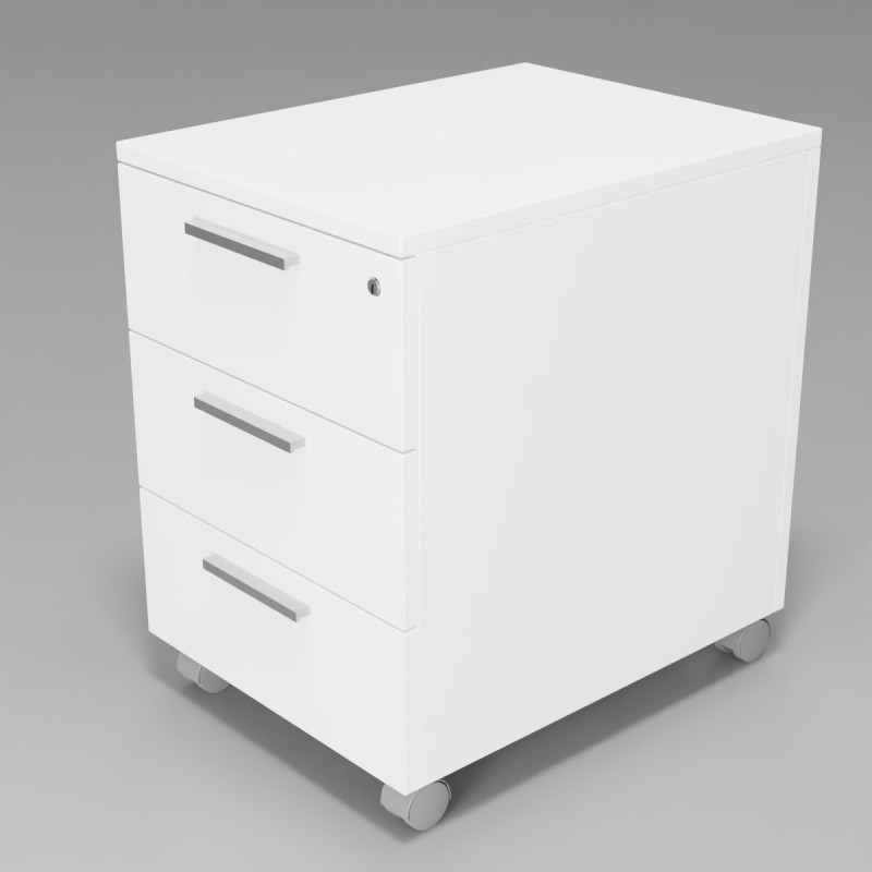Bloco 3 gavetas com rodas e chave (fecho centralizado que feche todas as gavetas com puxador de alumínio. 4 cores disponíveis: branco, cinza e cores de madeira: bordo e carvalho claro.