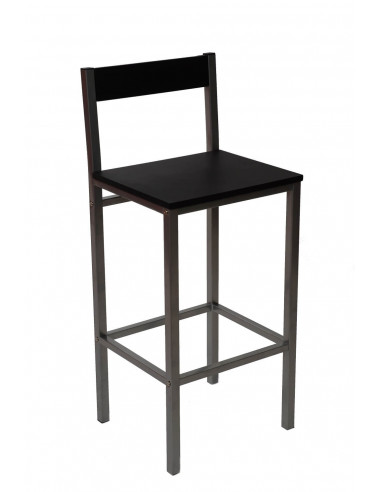 Banco de bar robusto e económico. Altura 70cm. Estrutura em ferro e assento em MDF revestido em PVC. Estrutura Preta com Assento: Wengué, Nogueira e Carvalho Claro. ou estrutura cinza com assento preto.
