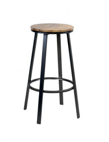Banqueta alta redonda com estrutura metálica e apoio para os pés.
