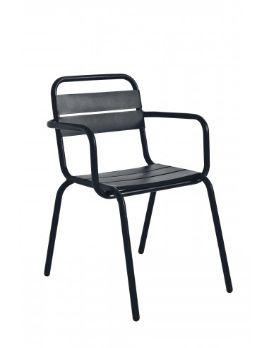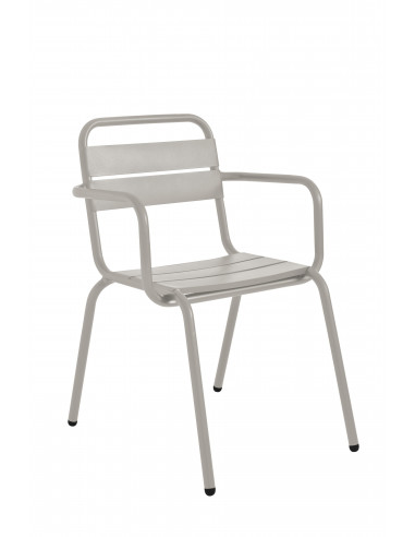 Cadeira com braços de alumínio de estilo mediterraneo. Ideal para exterior, já que a estrutura é fabricada em alumínio. Máxima resistência à corrosão. Acabamento: alumínio lacadado em pó de poliéster (epóxi) em ampla gama de cores muito vivas. Ver, também, cadeira, rede e banco para o jogo.