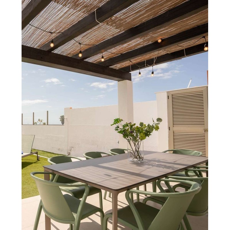 Cadeira empilhável fabricado em polipropileno reforçado com fibra de vidro. Tem incorporados tacos de borracha anti-derrapante nos 4 pés. Válido para uso no exterior. Proteção contra raios UV.