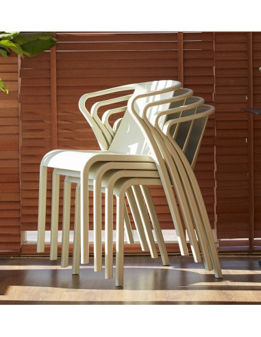 Poltrona varanda de um design moderno e com um ar retrô ou vintage para equipar os terraços de hotelaria de bares e restaurantes. Esta cadeira do terraço é empilhável e está disponível em uma gama de cores que se adaptam à decoração de locais, tanto exteriores como interiores.