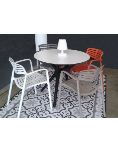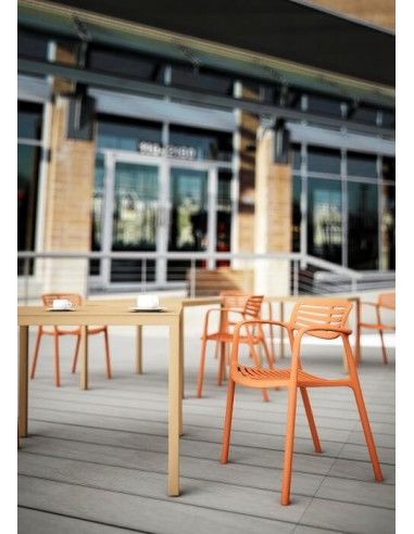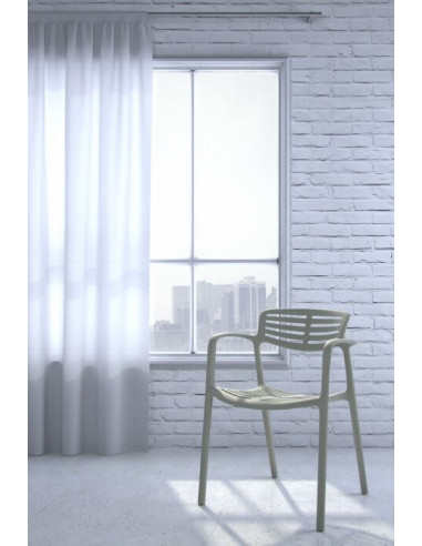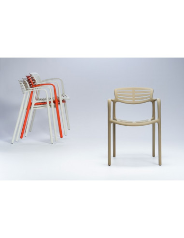 Cadeira com braços para uso interior e exterior. Fabricada em uma única peça de polipropileno com fibra de vidro, utilizando tecnologia de modelação assistida por gás. Empilhável.