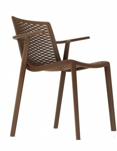 Cadeira de hotel empilhável com braços, com um design muito original e leve. A cadeira modelo NET KAT foi projetada por Josep Lluscà para uso interno e externo. Injetado em polipropileno e fibra de vidro. Proteção UV. Ideal para mobiliar restaurantes e bares, em terraços e jardins.