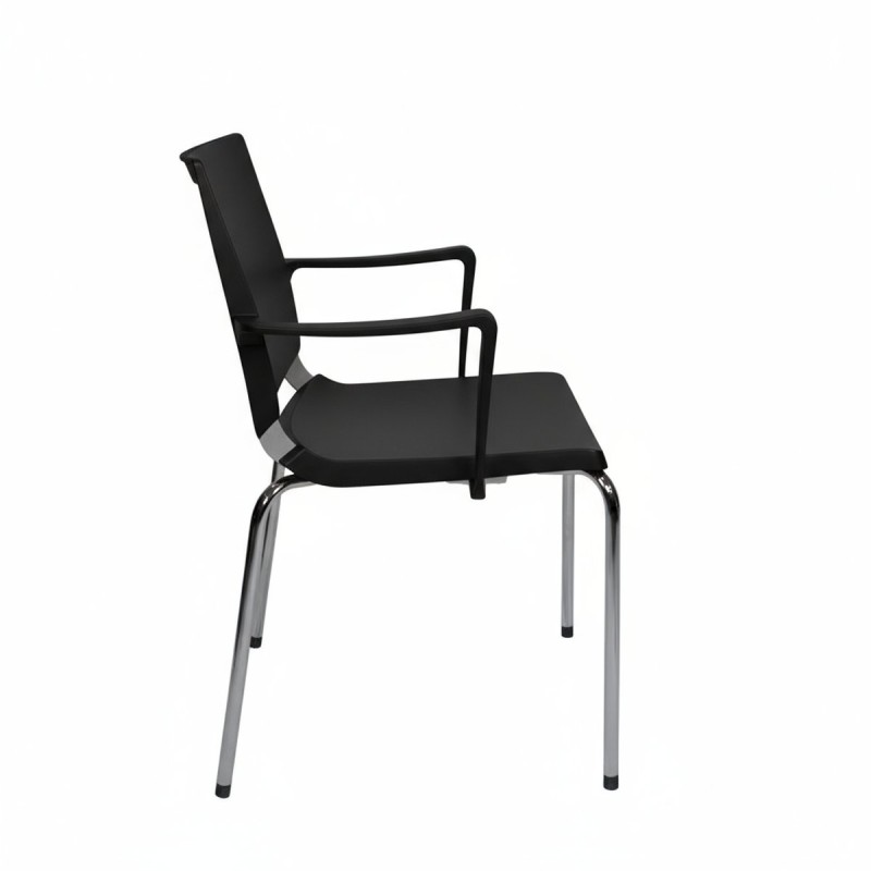 Cadeira de design polivalente de 4 pés, com braços, estrutura em metal com acabamento cromado. Encosto e assento em polipropileno, disponíveis em várias cores. Como opção, o banco pode estofar. Seu design de linhas puras, permitem que se enquadre em espaços tão diversos como uma sala de reuniões, um escritório ou sala de jantar de um restaurante. De fácil manutenção.