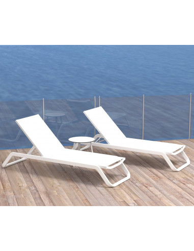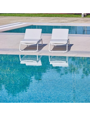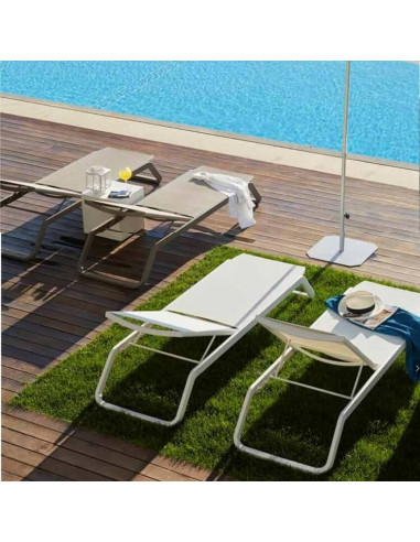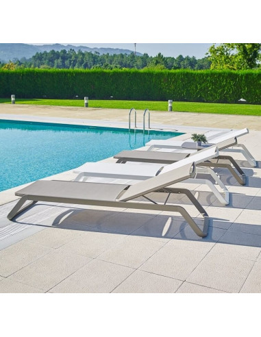 Nova cadeira de design, empilhável para piscinas. Este modelo de cadeira é ideal para instalações em que as espreguiçadeiras ter que empilhar e empilhar frequentemente. O projeto do pé em fibra de vidro, facilita que não se rayen os pés durante o processo. A estrutura de alumínio a torna uma das espreguiçadeiras mais robustas do mercado. Reclinável em 5 posições.