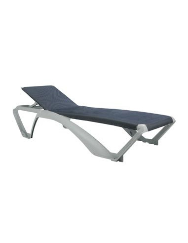 Espreguiçadeira empilhável modelo MARINA com estrutura em polipropileno e fibra de vidro em branco. 850 g/m² Texthilene, soldado a quente, para maior resistência e trama e urdidura de fio duplo. Proteção U.V. Rodas nas pernas traseiras e patilhas antiderrapantes na frente e atrás. Inclui porta-copos. Peso líquido 10,65 kg. Reclinado em 4 posições.