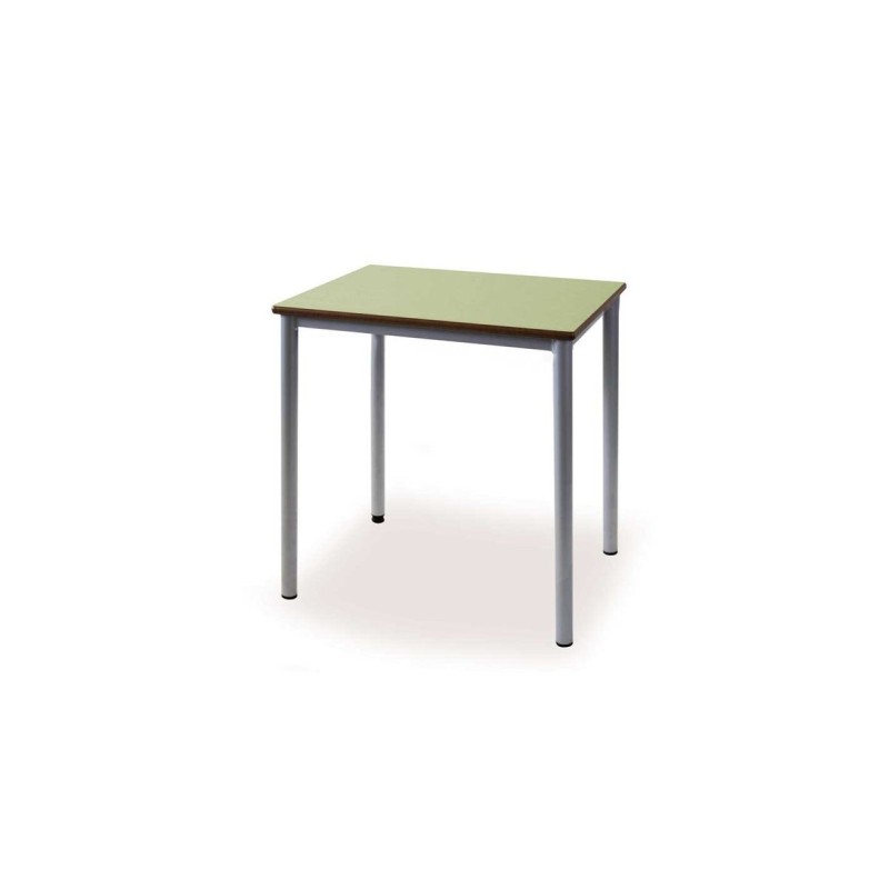 Mesa escolar para jovens/adultos com estrutura tubular em aço nas cores cinzento, verde ou preto. O tampo é fabricado em laminado nas cores branco creme (L-138), verde (L-302) ou faia (L-416) com rebordo em MDF.