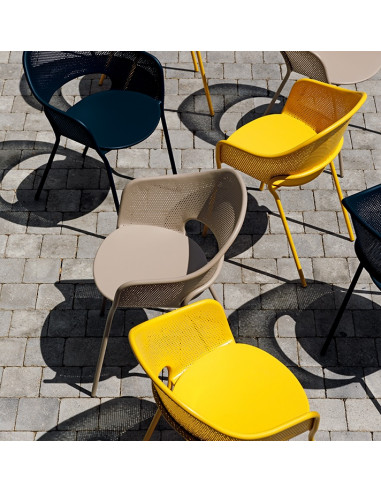 Com esta peça, Patrick Jouin lança um novo olhar sobre a icónica cadeira Facto, a sua primeira peça, que entrou pela primeira vez no catálogo da Fermob em 1998. É uma cadeira de exterior com uma silhueta simples e feita de um único material: chapa de aço macio . Patrick usa esses recursos para criar uma poltrona deliciosa, elegante, simples e acolhedora, prática e confortável. O encosto em forma de concha, que se ajusta perfeitamente à estrutura, desenvolve um complexo sistema de perfurações irregulares que se estendem harmoniosamente. O design geral flerta com a alta costura para alcançar uma oferta estética tecnicamente exigente.