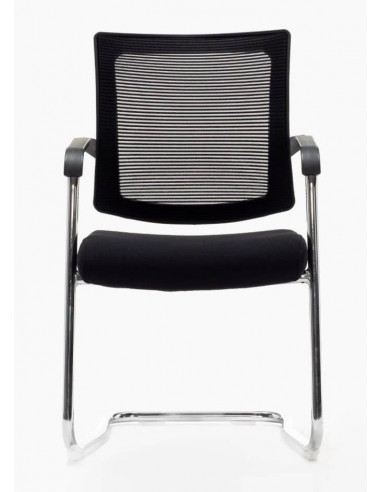 Cadeira confidente com estrutura em aço cromado, braços, assento estofado na cor preta em tecido flex com borracha espuma interna de alta densidade e encosto de malha de toque "efeito de tela" muito agradável e de alta resistência. Esta cadeira é perfeita para escritórios de endereço e salas de reuniões.